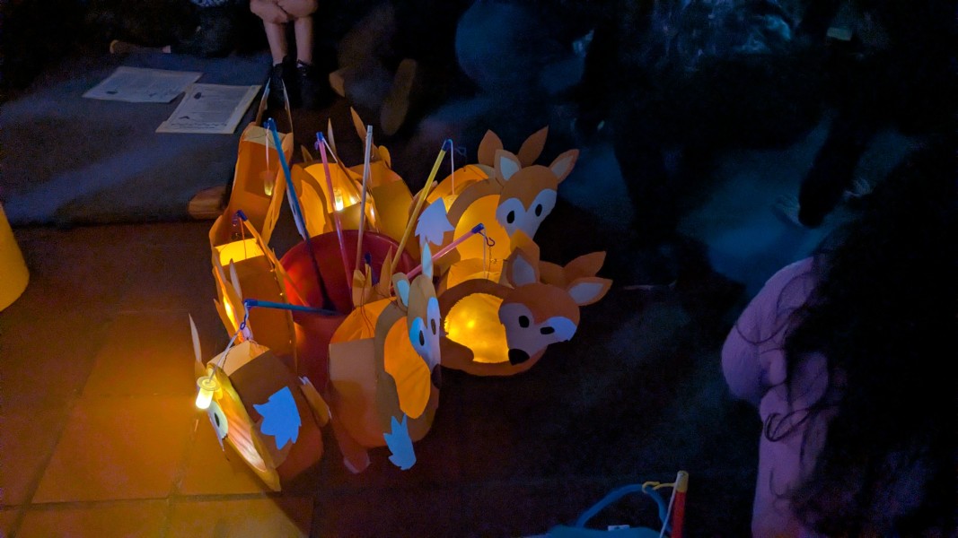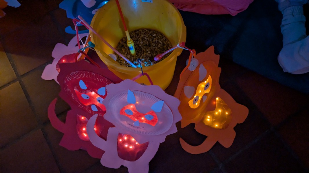Die Kinder zeigten auch stolz ihre selbstgebastelten Laternen. Zusammen haben wir viele Martinslieder gesungen. Eine Kollegin der LVR-Johannes-Kepler-Schule hat am Anfang und am Ende auf dem Saxophon gespielt. Das machte die Feier besonders festlich.